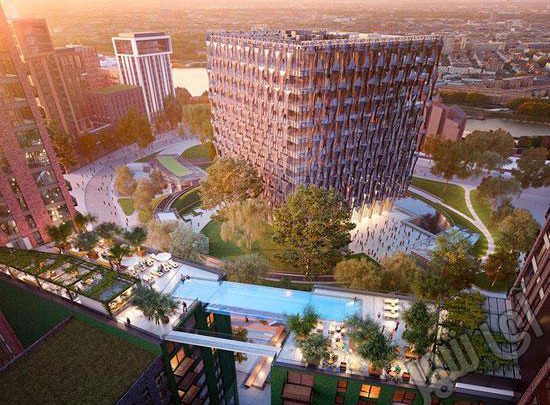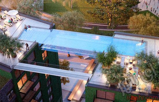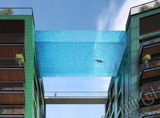 آی شهر : گروه طراحی Ballymore در لندن دست به کار شگفت انگیزی زدند. ساختن استخری در ارتفاع ۱۱۵ فوتی که بین دو ساختمان ۱۰ طبقه قرار دارد. این استخر امکان شنا کردن در دل آسمان و بر فراز River Thames را برای ساکنین این دو مجتمع، فراهم می کند. اسکای پول ۹۰ فوت ارتفاع و ۱۹ فوت عرض دارد که از شیشه ای با ضخامت ۸ اینچ ساخته شده است!