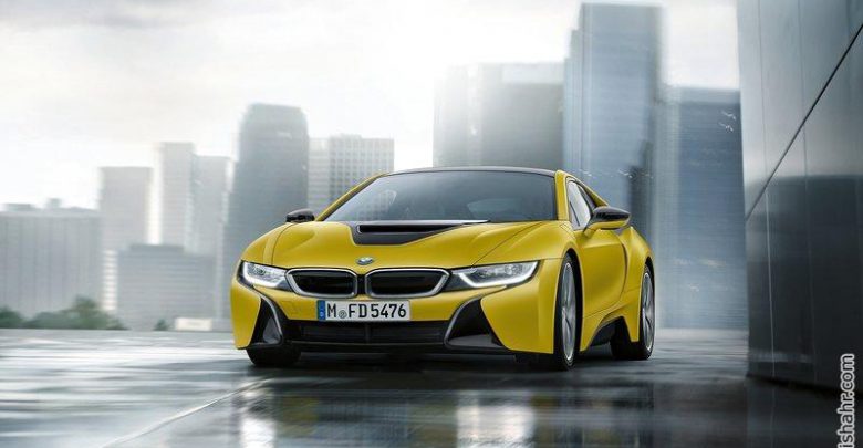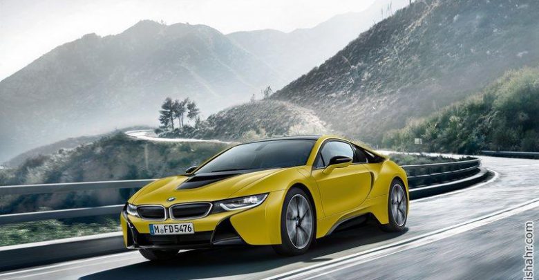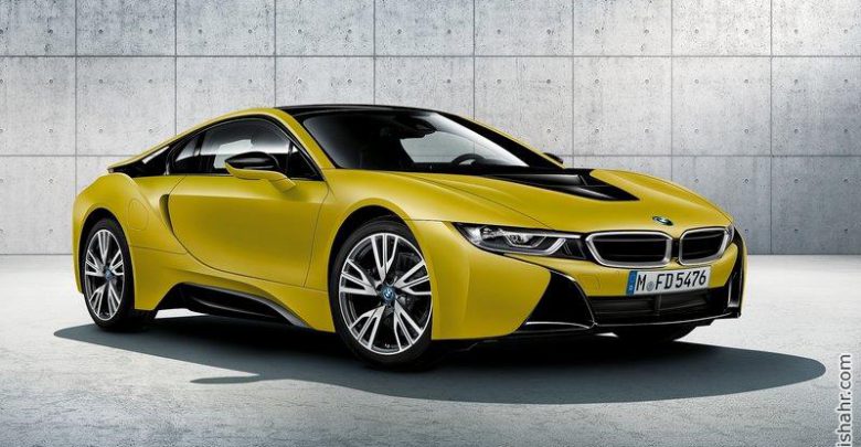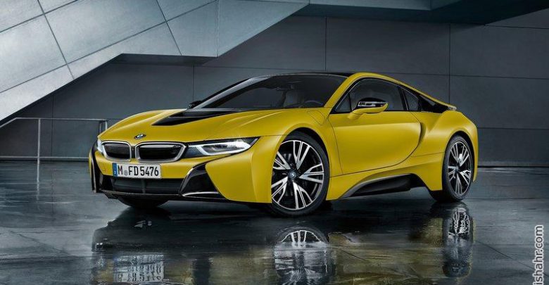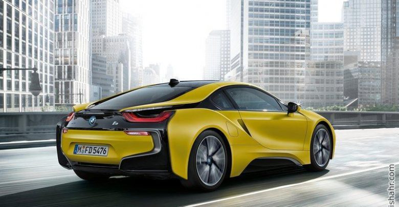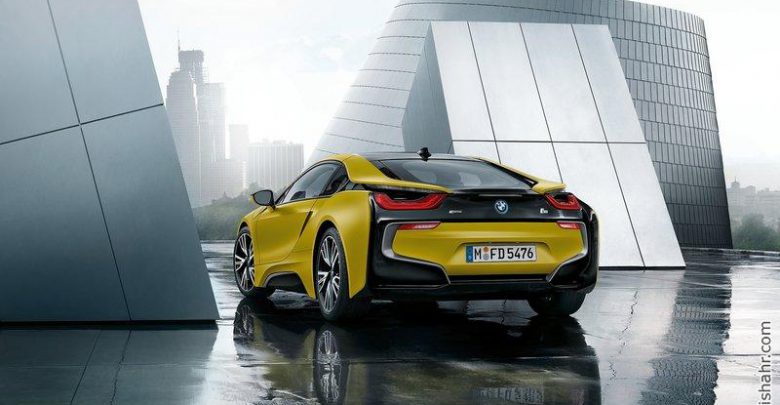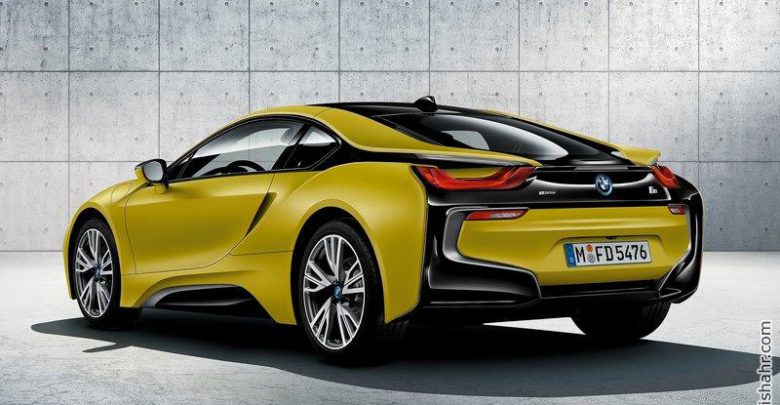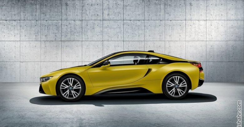BMW i8 مدل ۲۰۱۸  پروتونیک منجمد زرد ، با بدنه پلاستیکی تقویت شده با فیبر کربن و چرخ های ۲۰ اینچی با آلیاژی سبک و مستحکم